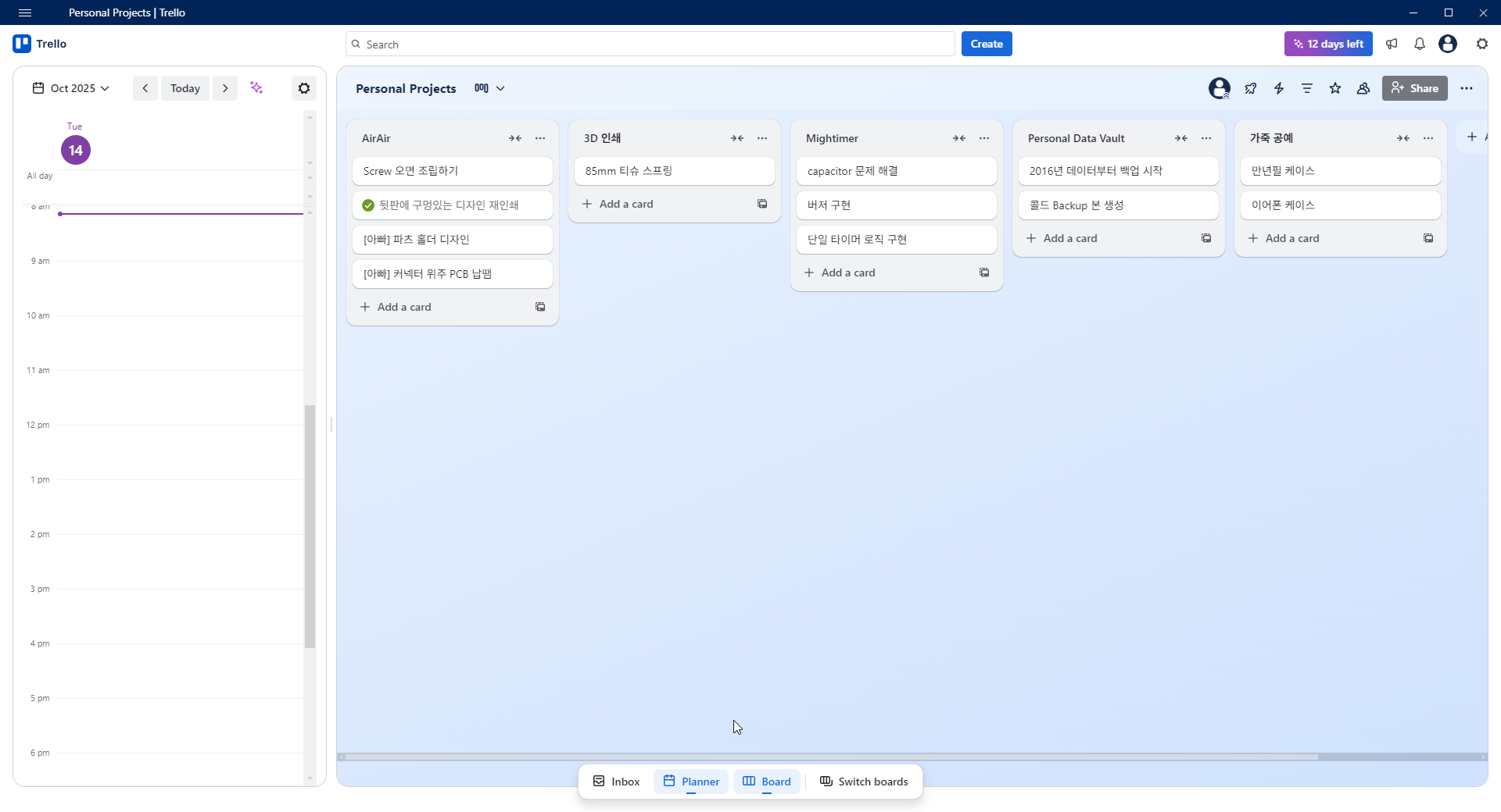 내가 좋아했던 다양한 취미들을 다시 들여다보고, 연구를 하며 늘 고민하던 프로젝트 관리 문제를 해결해보기 위해 이번에는 Trello를 다시 꺼내 들었다.과거 스타트업에서 일하던 시절 여러 프로젝트 관리 도구를 접할 기회가 있었는데, 그때 처음 만난 서비스다. 당시에는 삶도 회사 일도 지금보다 훨씬 단순해서 오히려 불편하게 느껴졌지만, 지금은 그 기능이 꽤 마음에 든다. 아래는 개인 작업용 보드의 스크린샷이다.